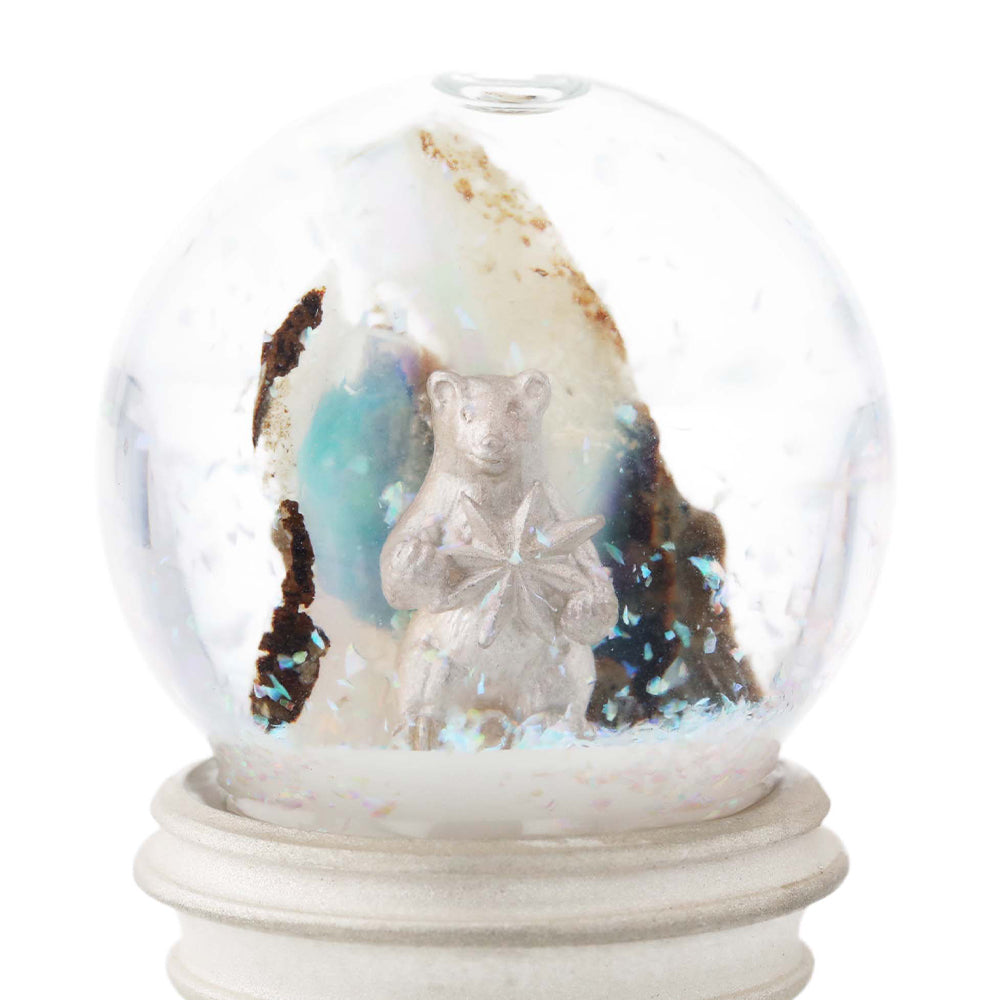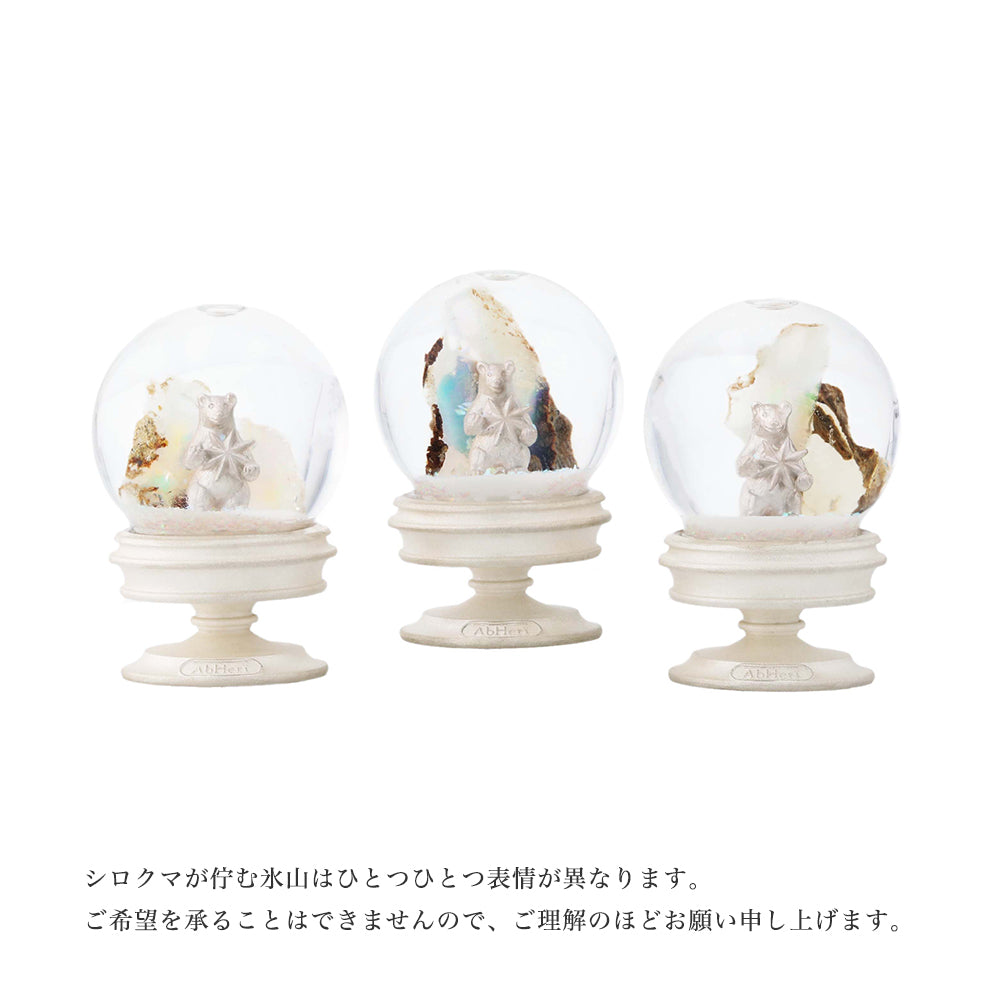 ポーラーベアは、北極圏に棲む絶滅危惧種の「シロクマ」のこと。ポーラーは、北の空に輝く「北極星」を意味する言葉です。七色にきらめく雪には、ジュエリー制作過程で使用できなくなったオパールのかけらを再利用しています。粉状のオパールは雪に、原石のかけらは氷に見立て、直径3センチほどのミニチュアドームの中に、白銀の世界を表現しました。